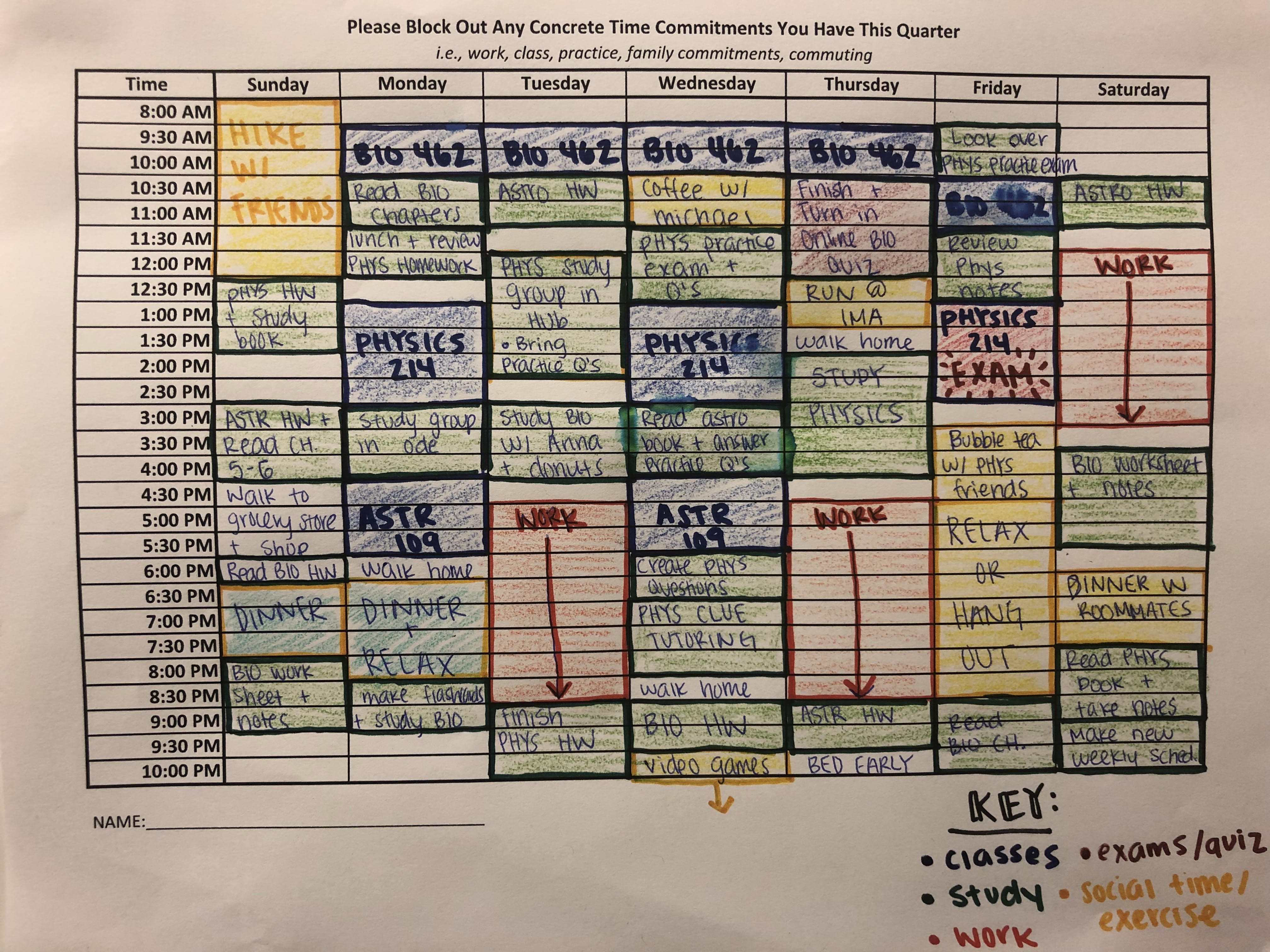 College is busy! Time management is one of the most important skills you can master to succeed academically. Allocating your time and energy will help you feel more present and will hopefully give you some breathing room. Once you start to develop the habit of actively managing your time, you can be more open to participating in other campus activities because you are able to balance the demands of your course load, research, employment, and commitments to your friends and to yourself.